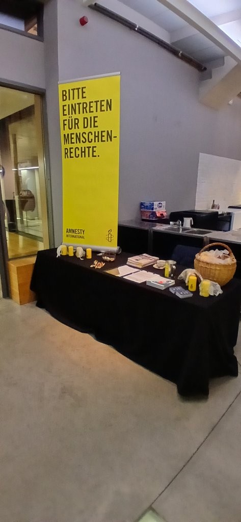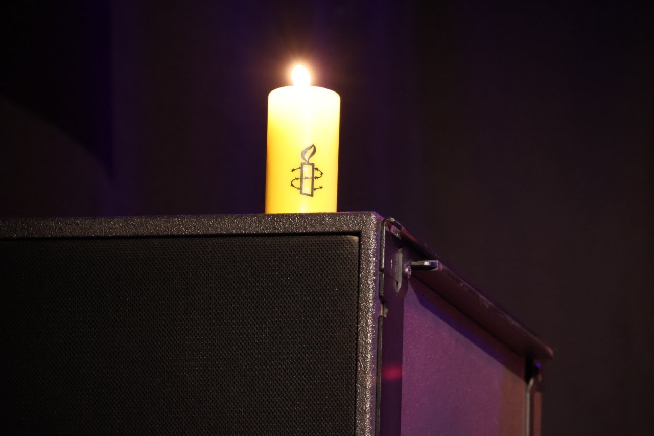 Das Konzert beginnt mit einer brennenden Amnesty-Kerze. Dem Motto folgend: ES IST BESSER EIN LICHT ANZUZÜNDEN; ALS ÜBER DIE DUNKELHEIT ZU KLAGEN! wurden während des Konzertes immer mehr Amnesty-Kerzen angezündet. Diese haben wir vor dem Konzert an unserem Infotisch angeboten. Eine gute Gelegenheit über unsere Menschenrechtsarbeit zu informieren.